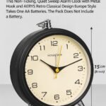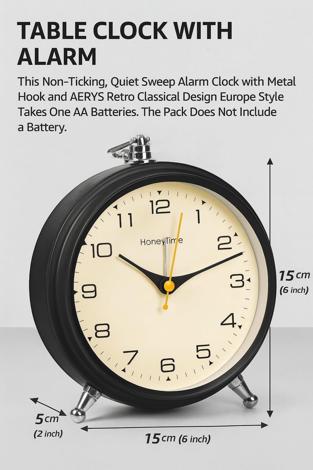 - TABLE CLOCK WITH ALARM: This non-ticking, quiet sweep alarm clock with a metal hook and an AERYS Retro Classical Design Europe style takes one AA batteries. The pack does not include a battery.