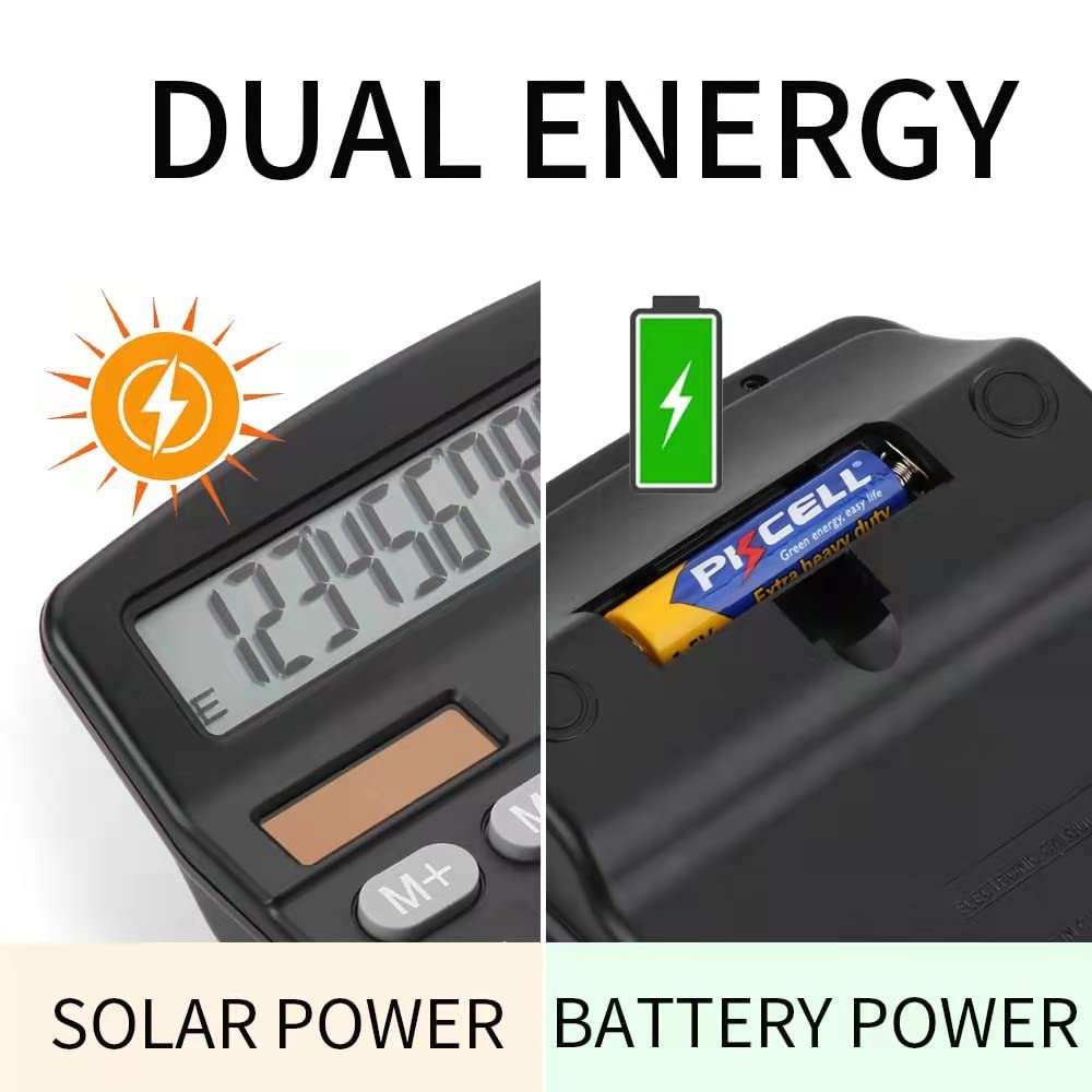 • ♪DUAL POWER♪:The desktop calculator is powered by a dual power supply of solar panels and AA battery(1 AA Battery included) for long life and is not affected by the interruption of electricity during use.(NOTE:Some user may use calculator in the early morning or night.The screen maybe difficult to read in low light without battery power.Please insert our AA battery for continuous and accurate usage.)