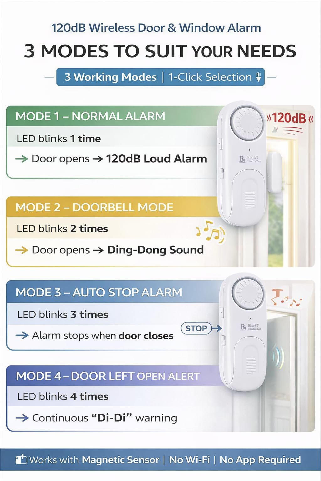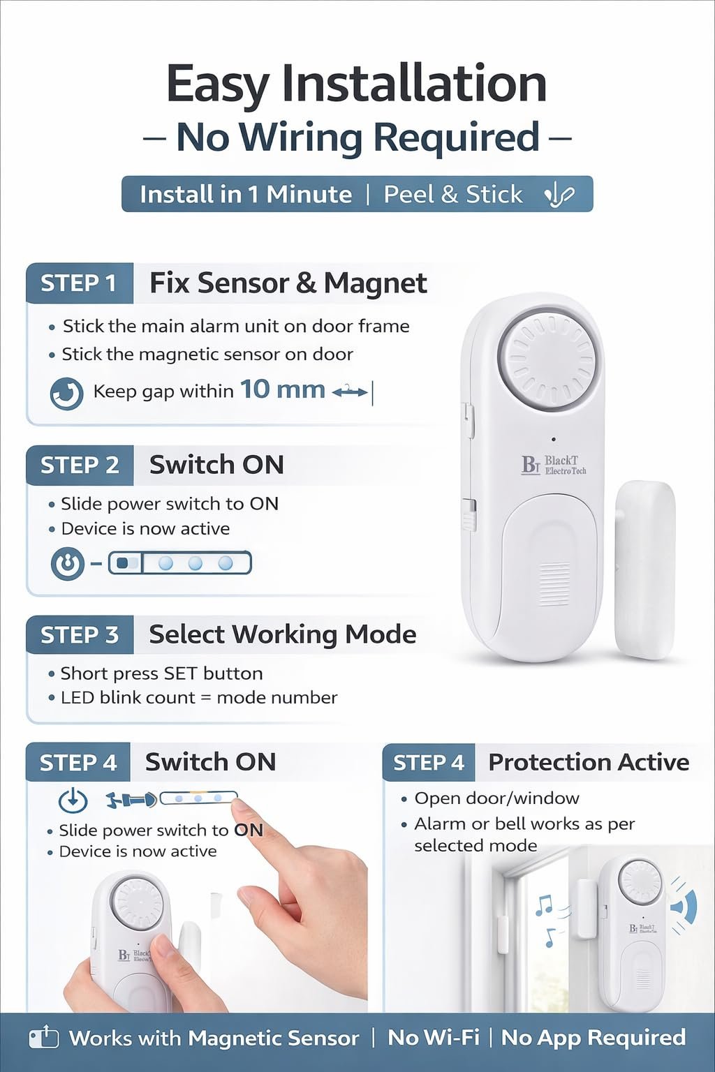 BlackT Electrotech (BT51D) 120dB Wireless Door Bell & Window Alarm Sensor – 4in1 Smart Calling Bell for Home, Office Cabin & Property Security – No Wire, Easy Installation