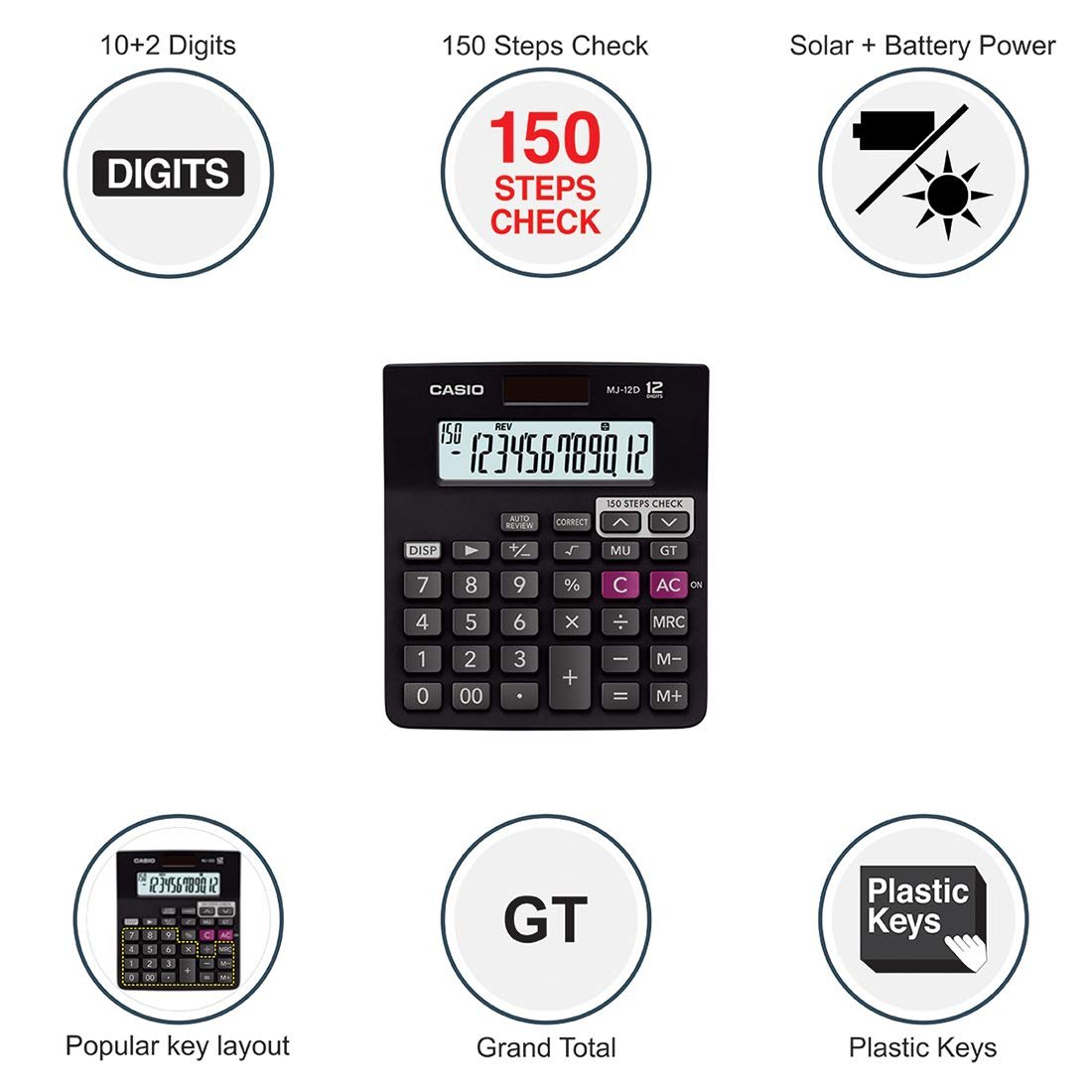 Casio Desktop Calculator & MJ-12D 150 Steps Check and Correct Desktop Financial Calculator, Black
