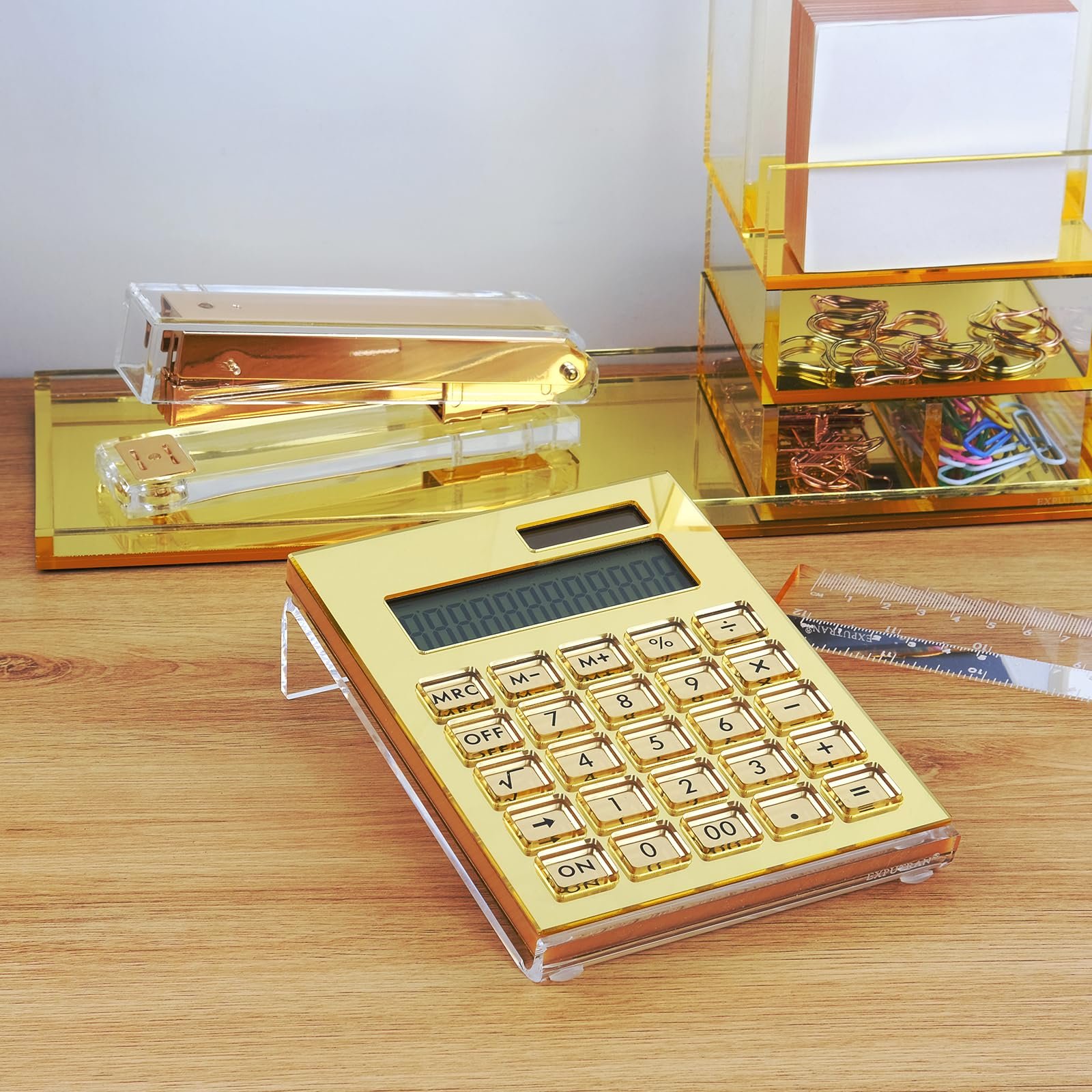 EXPURTAN Acrylic Calculator and Acrylic Stand, Battery and Solar Hybrid Powered LCD Display,12-Digit, Acrylic Office Desktop Accessories(Gold)