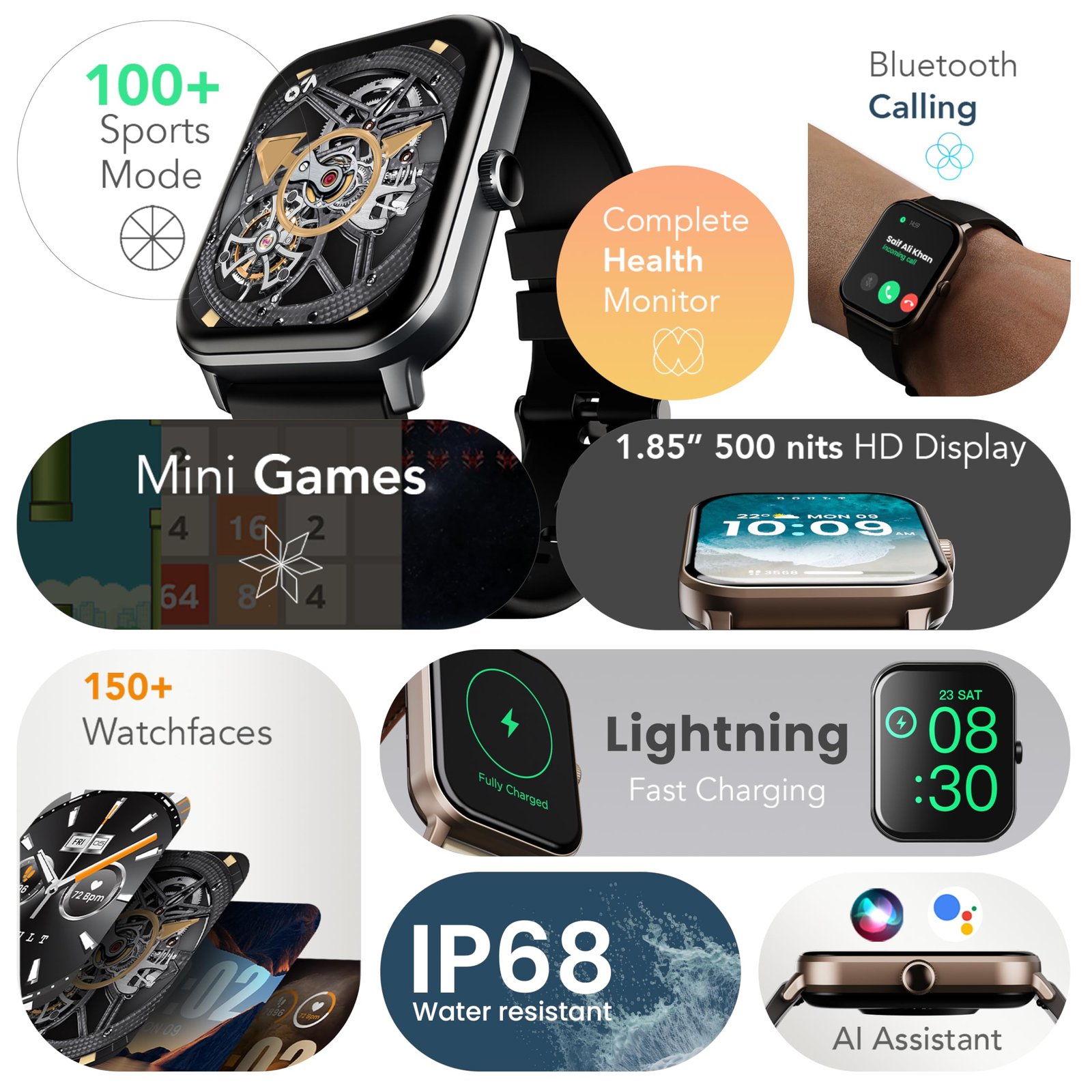 • ✅Smart Notifications & AI Voice Assistant: Receive smart notifications from your favourite social apps and messages. The AI voice assistant provides hands-free assistance, adding to the watch’s convenience.