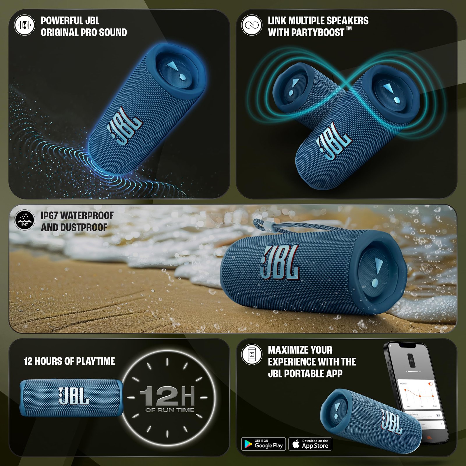 JBL Flip 6 Wireless Portable Bluetooth Speaker Pro Sound, Upto 12 Hours Playtime, IP67 Water & Dustproof, PartyBoost & Personalization App (Without Mic, Blue)