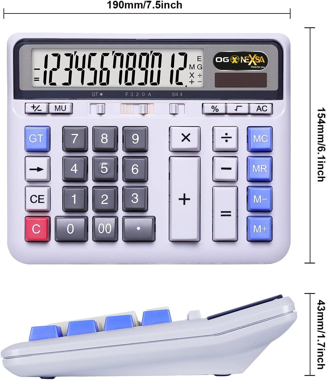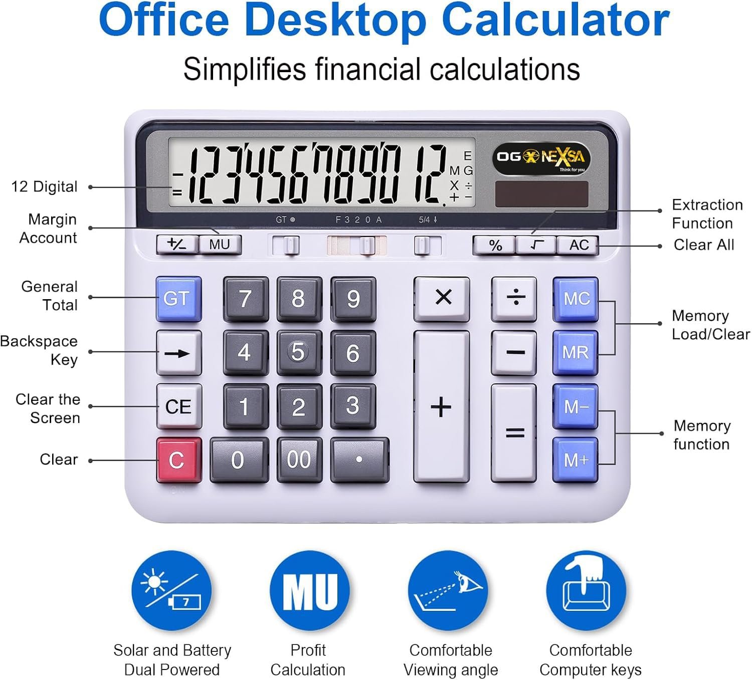 NEXSA Desktop Calculator Solar Battery Dual Power with 12-Digit Large LCD Display and Large Computer Keys Office Calculator for Home Office School