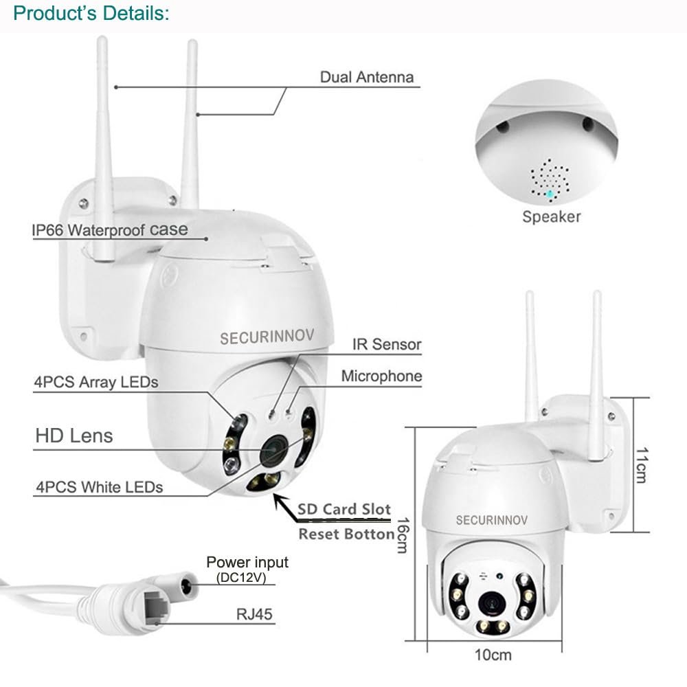 - SECURINNOV :- Color Night Vision with Dual LED Lights Powerful IR + White LEDs provide full-color night vision up to long distance, delivering bright and clear footage even in total darkness.