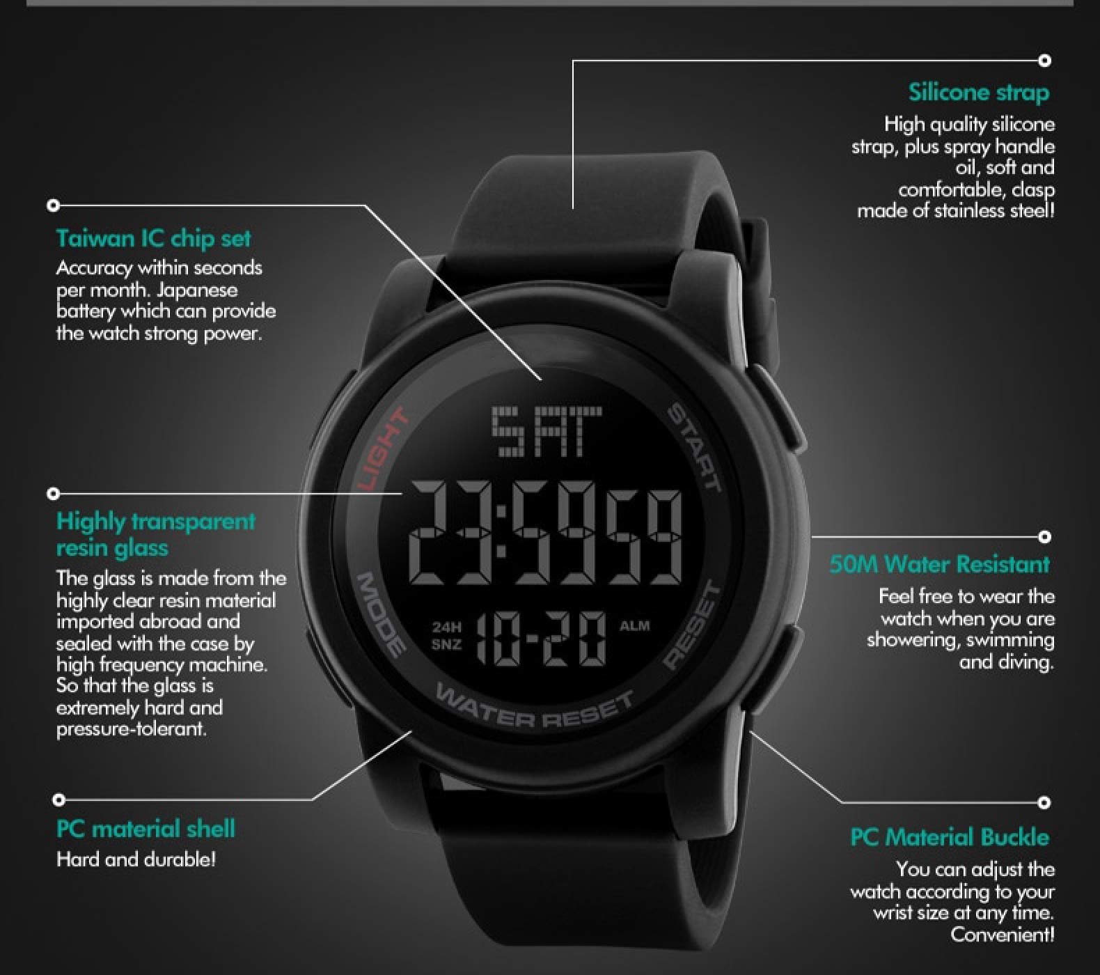 • Multi-Functions: Complete Calendar, Chronograph, Week Display, LED Display, Countdown ; Movement: Digital Movement ; Band Material Type: Silica gel